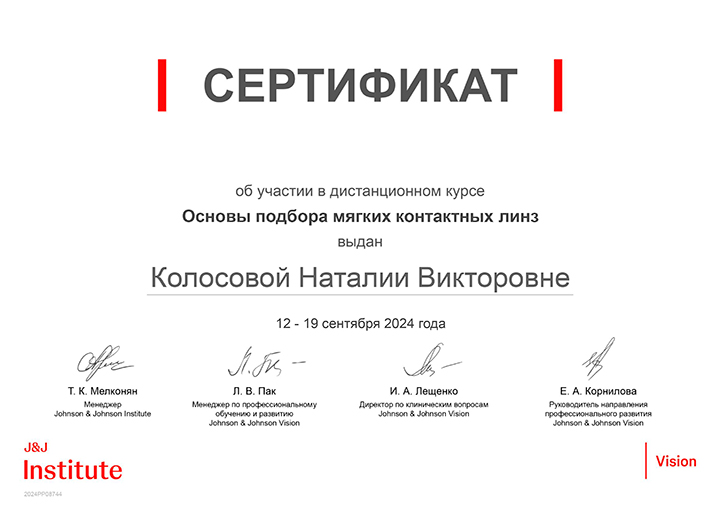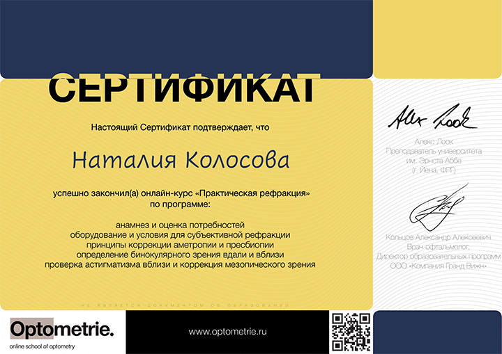 Регулярное участие в обучающих мероприятиях от ведущих мировых брендов помогает поддерживать высокий уровень квалификации и применять самые современные методы диагностики и коррекции зрения для достижения наилучших результатов.
